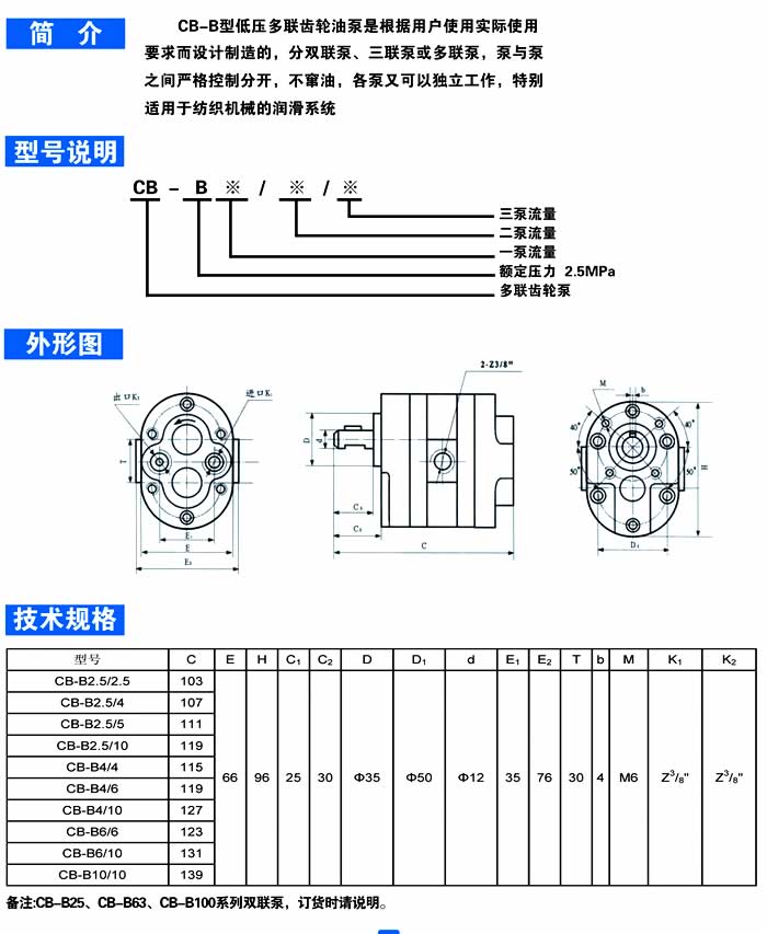 江苏双向泵阀有限公司:创建于1988年企业简称【泰兴市齿轮油泵厂】专业生产各种规格的高中低压齿轮泵,广泛应用于机床、减速机、齿轮箱、液压机械、稀油站,润滑设备,工程机械、矿山机械、起重运输机械、橡塑机械、注塑机械、胶合板机械、轻工机械、纺织机械液压系统中以及冶金、船舶、油站等领域。产品检测设备齐全、产品质量稳定可靠,专业生产CB-B系列齿轮油泵、CB2系列齿轮油泵、CB2-B系列齿轮油泵、CB3系列齿轮油泵、NB-B系列摆线泵、BB-B系列摆线齿轮泵、HY01系列齿轮油泵、齿轮油泵电机组,SNBY系列双向润滑油泵、SXF双向润滑油泵,R12-1润滑油泵、2KF系列大流量双向润滑油泵、CB-B系列低噪音大流量齿轮泵、CB-FA型、CB-FC型高压油泵、YB1叶片泵、联轴器、输送机油泵、打结刀以及特殊非标齿轮泵定做。公司宗旨是“以科技求发展,以质量求生存,以客户求效益,力求以先进的生产管理和严格的质量要求,向用户提供优质的产品和满意的服务”。 本公司坚持“,以人为本,以诚信为本”,做到质量第一,信誉第一,用户第一,服务第一。时间将做出保证:“泰兴双向液压值得信赖”。欢迎国内外工商界人士前来考察,洽谈,合作,共图发展.销售热线:0523-87491508 传真:0523-87497508